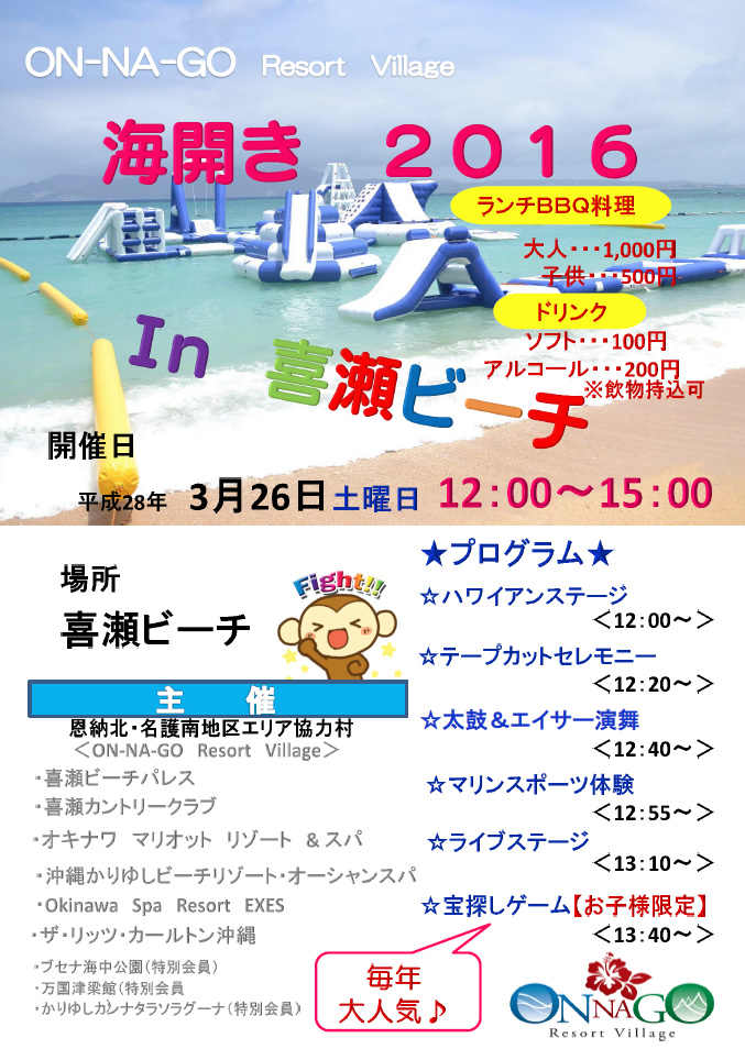 2016.03.01 ON-NA-GO Resort Village海開き2016 IN 喜瀬ビーチ 3月26日(土)に、毎年の恒例行事となりました海開きイベントを開催致します。フラショーやエイサーライブ、無料マリンスポーツ体験や、リゾートホテルの宿泊券が当たる大人気の宝探し(お子様限定)をご用意致しております。 今年も皆様と一緒に沖縄の夏を喜瀬ビーチで迎えたいと思います。入場無料でございますので、ぜひお気軽にお越しください。